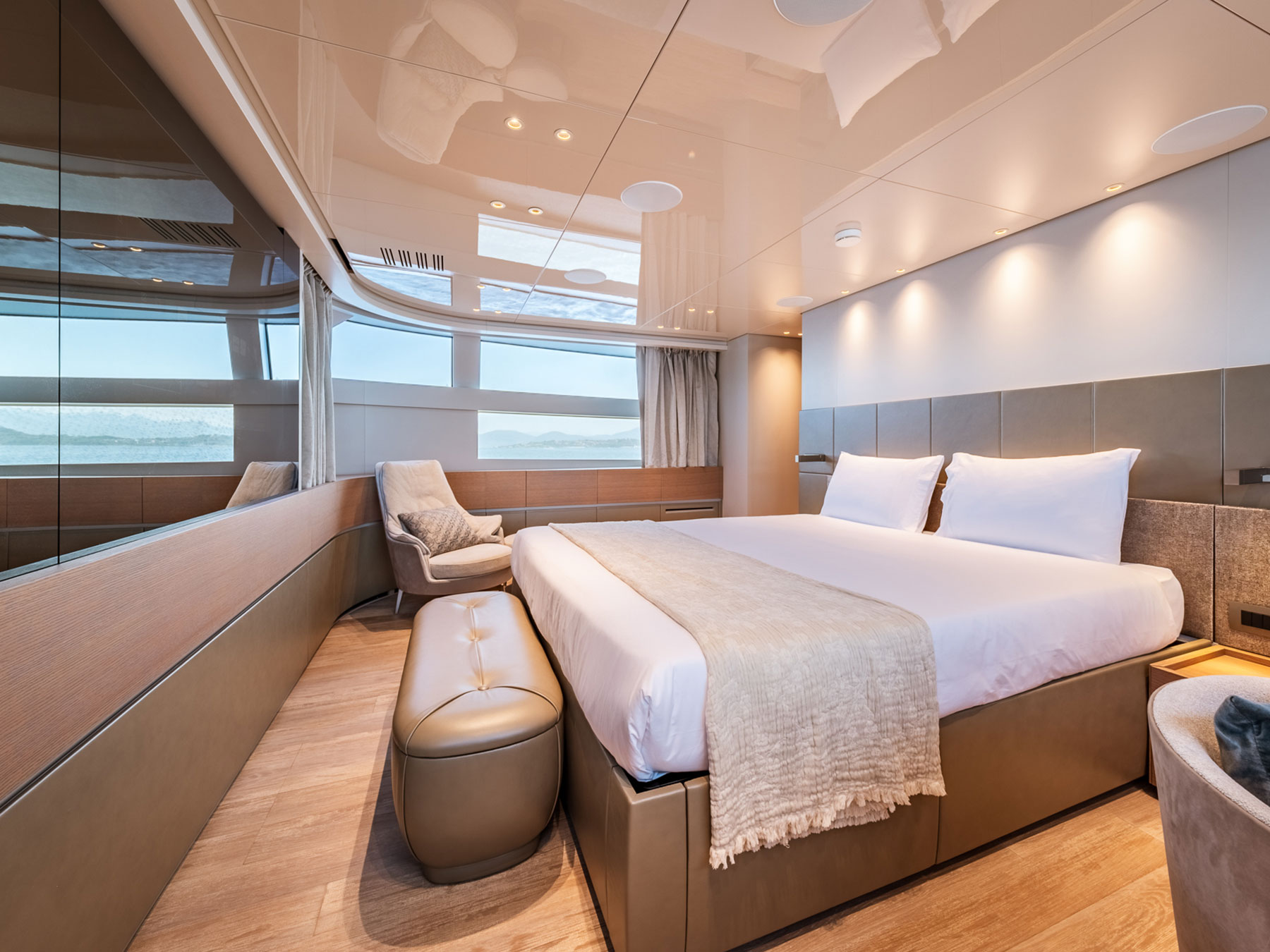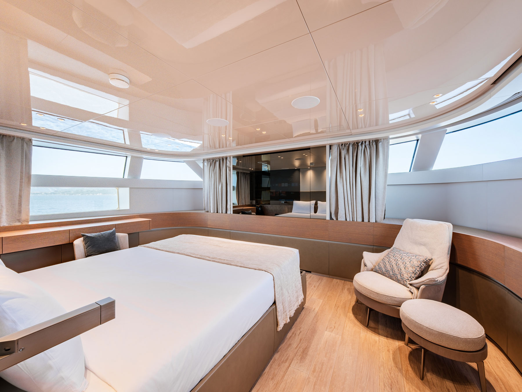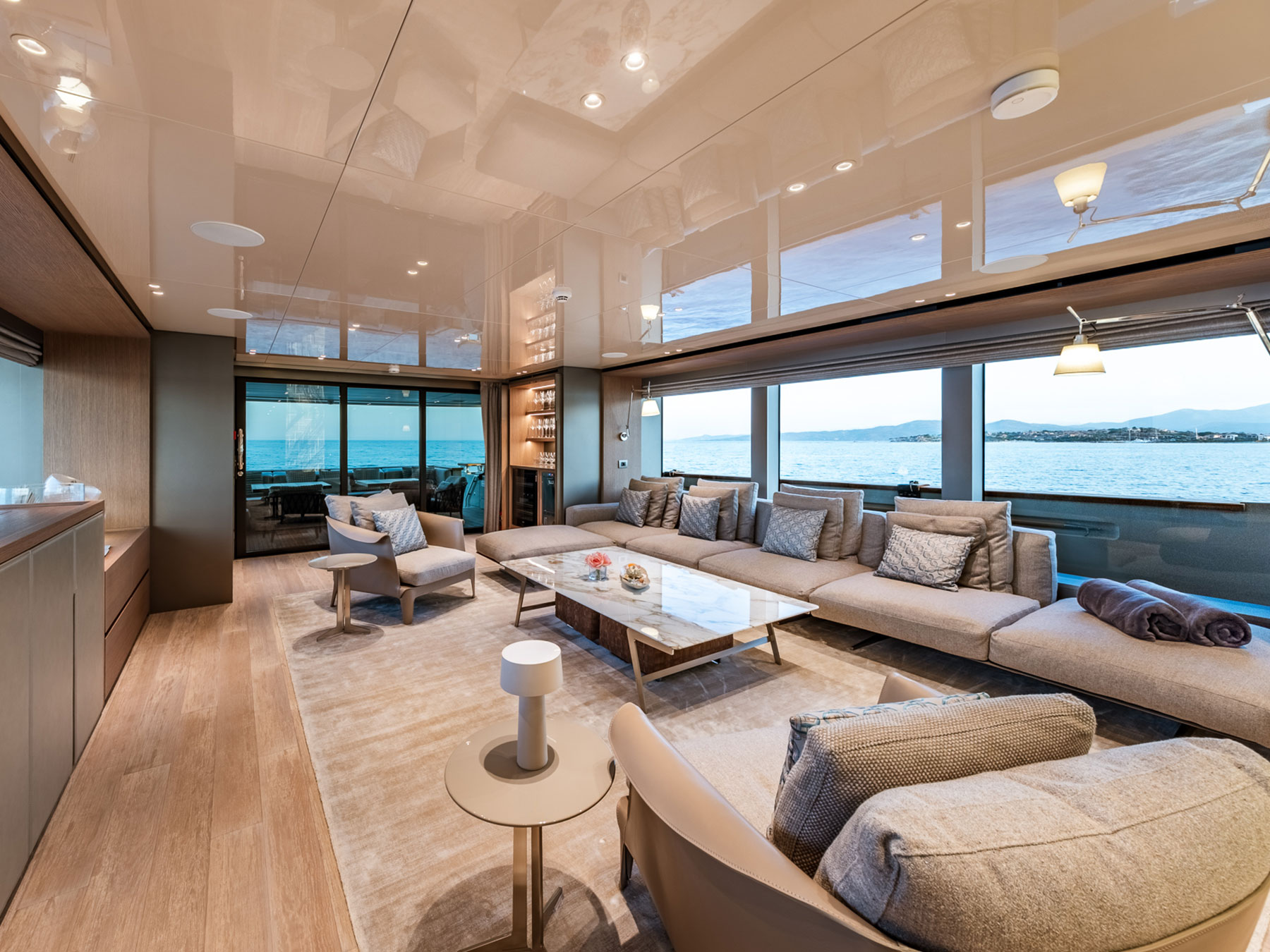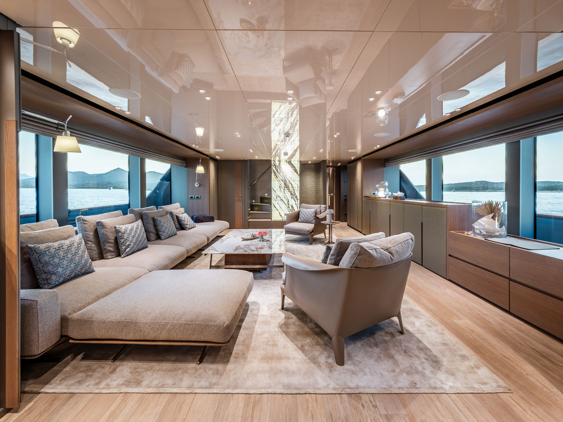 Zuccon International Project tarafından ustaca tasarlanan dış mekanlar, Sanlorenzo'nun kendine özgü zarafetiyle karakterize edilen iç mekanlarla kusursuz bir uyum içinde olup, çağdaş estetiği 1930'ların görkemli okyanus gemilerini anımsatan ince dokunuşlarla harmanlamaktadır.