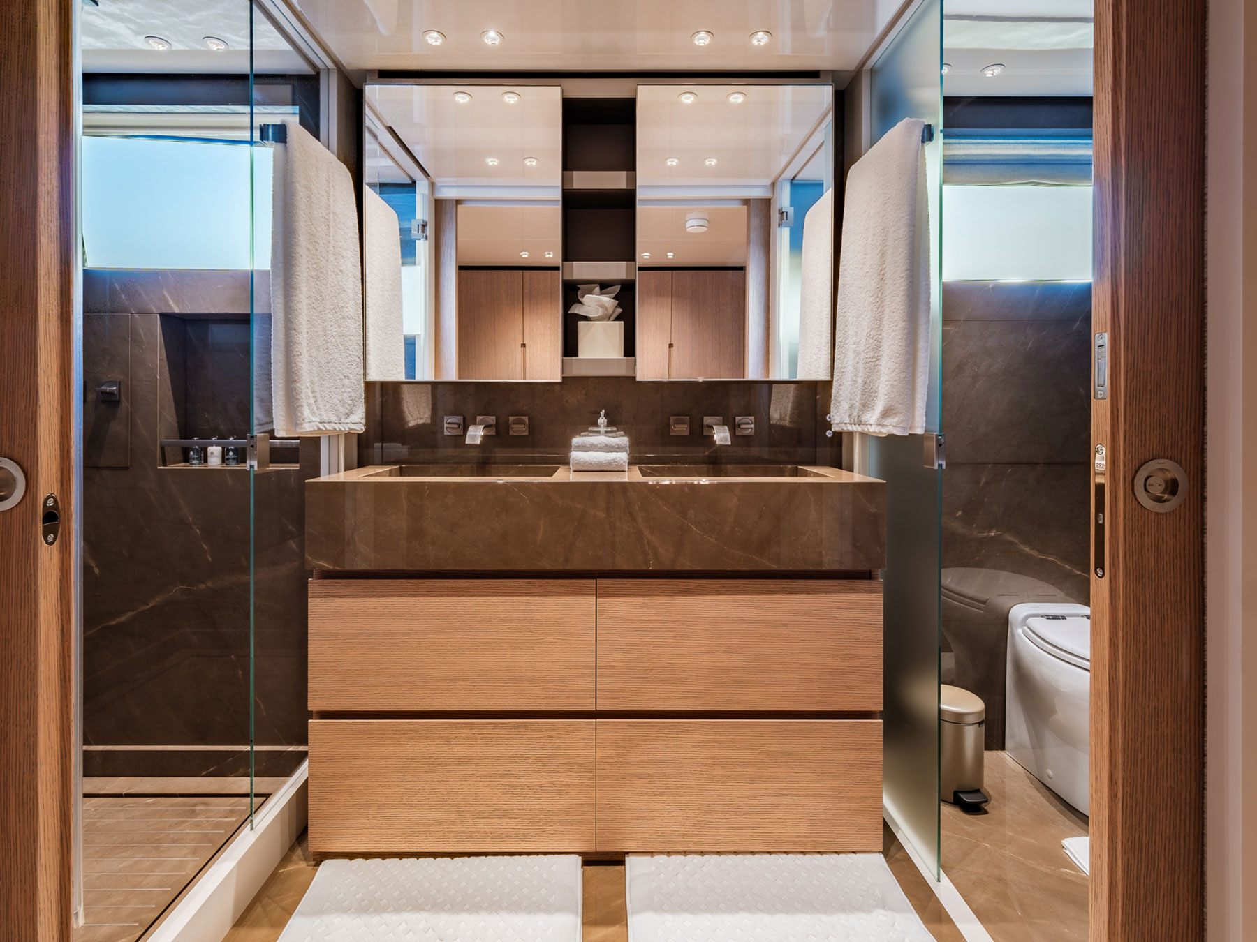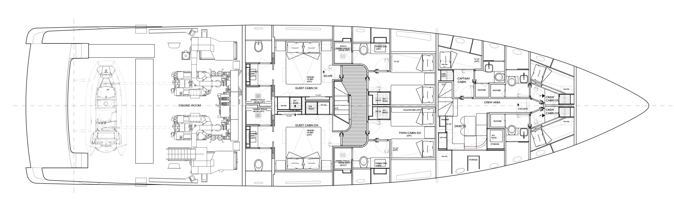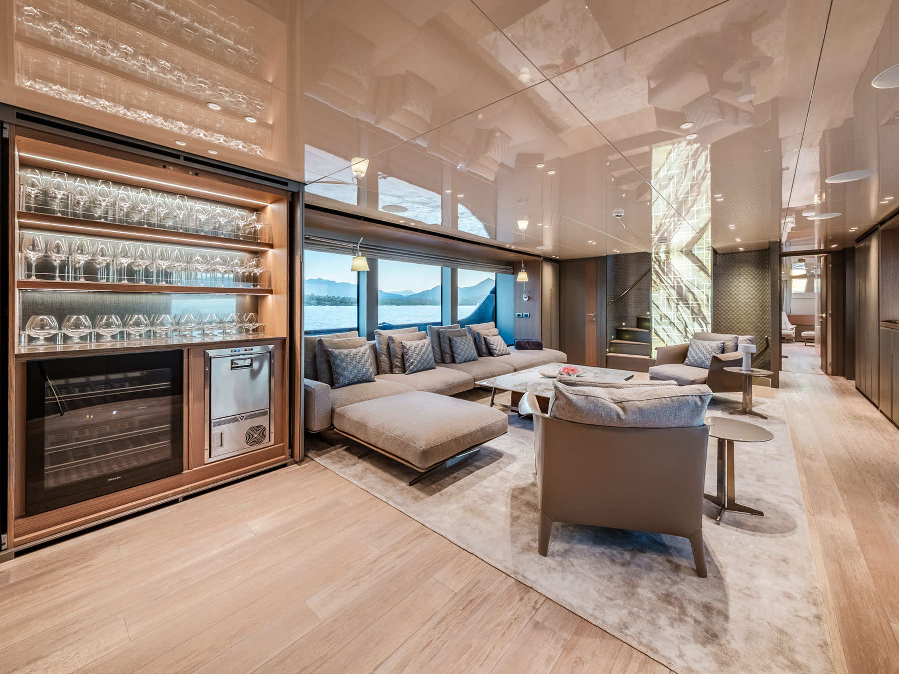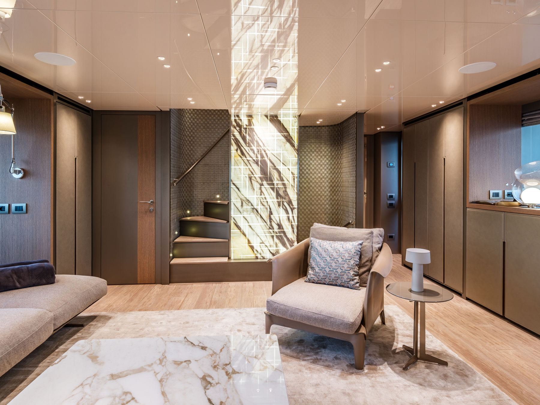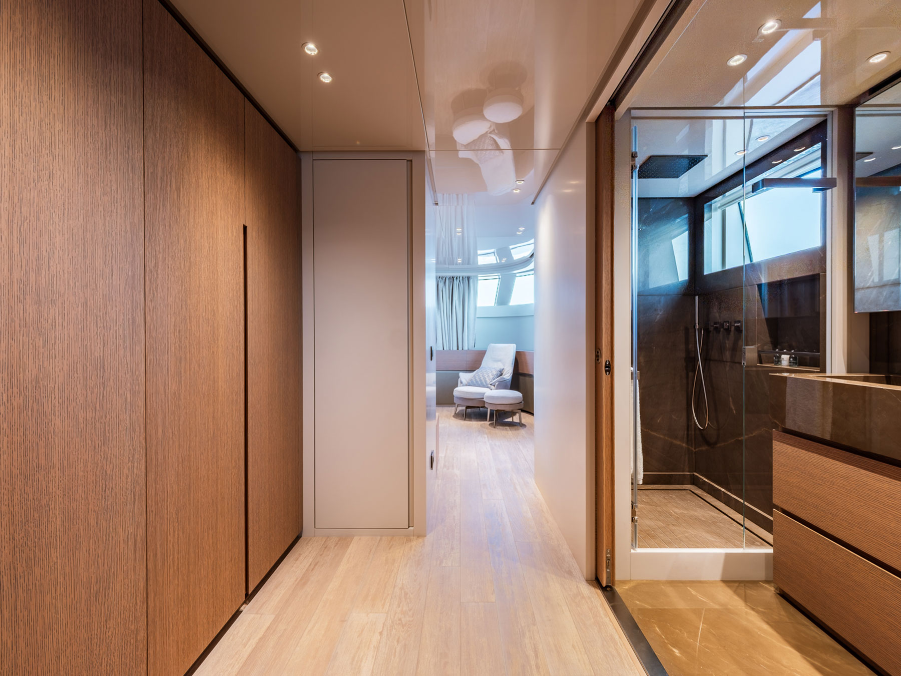 Zuccon International Project tarafından ustaca tasarlanan dış mekanlar, Sanlorenzo'nun kendine özgü zarafetiyle karakterize edilen iç mekanlarla kusursuz bir uyum içinde olup, çağdaş estetiği 1930'ların görkemli okyanus gemilerini anımsatan ince dokunuşlarla harmanlamaktadır.
