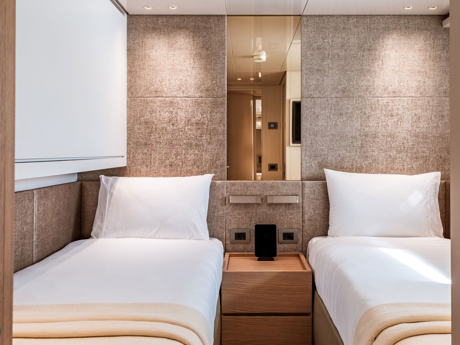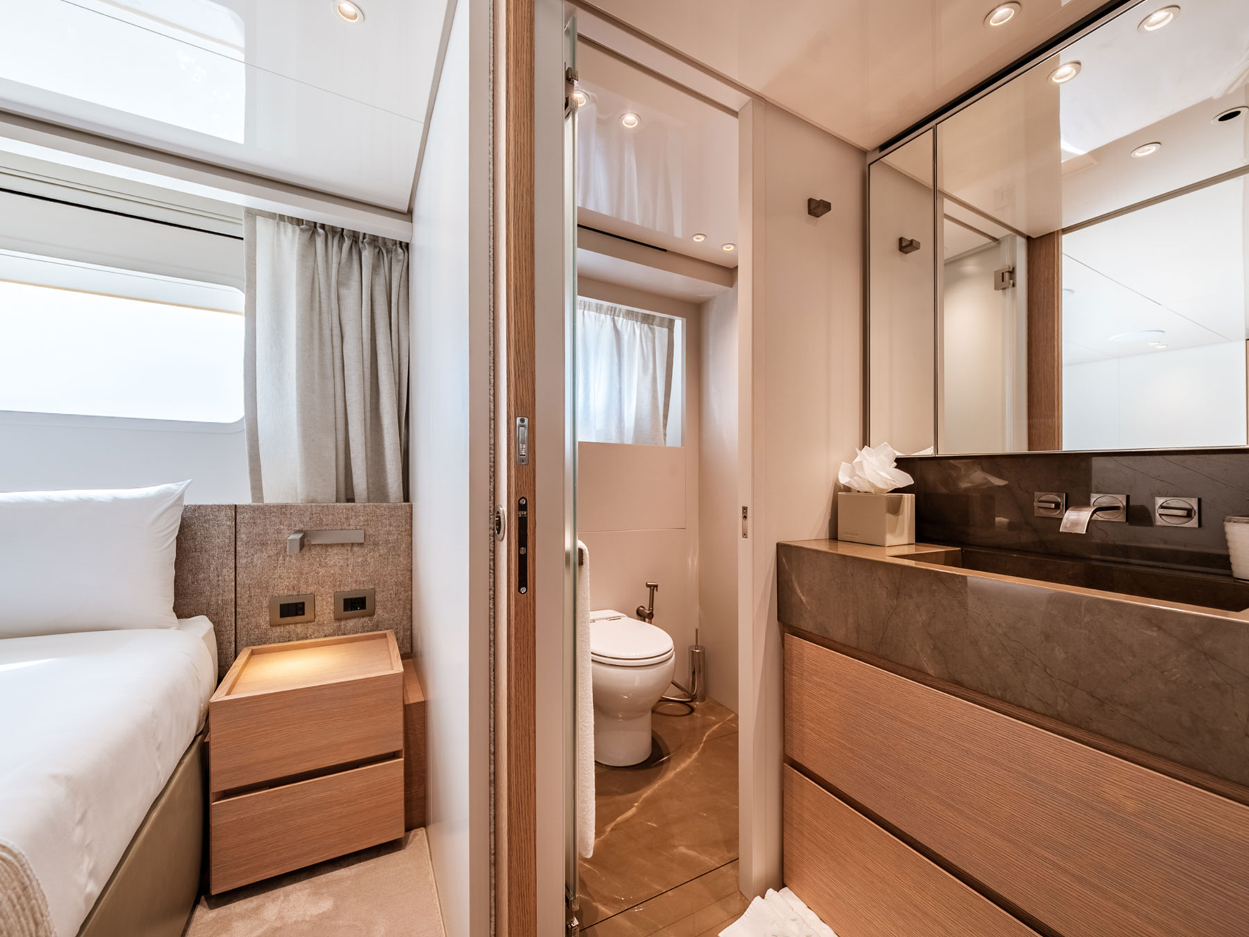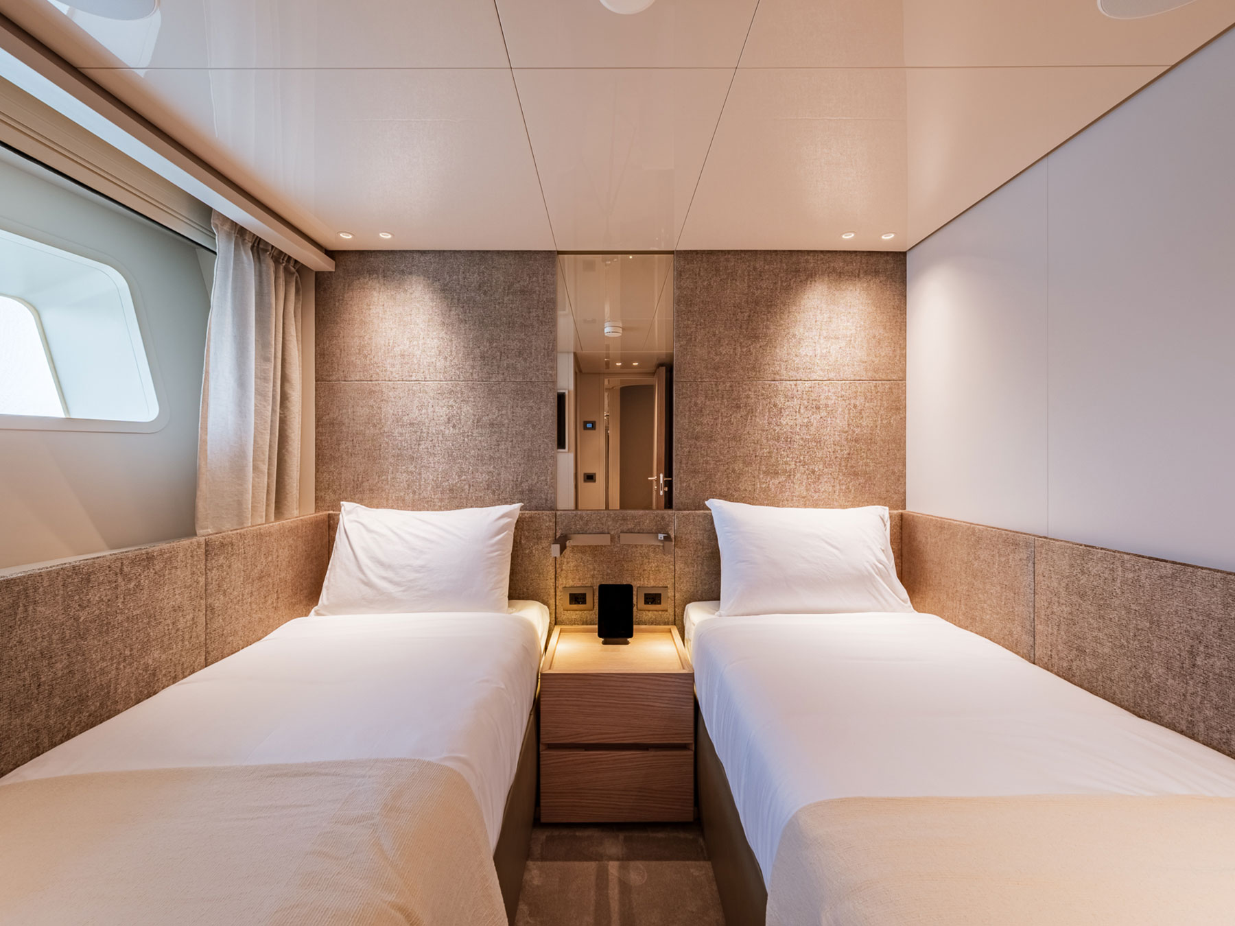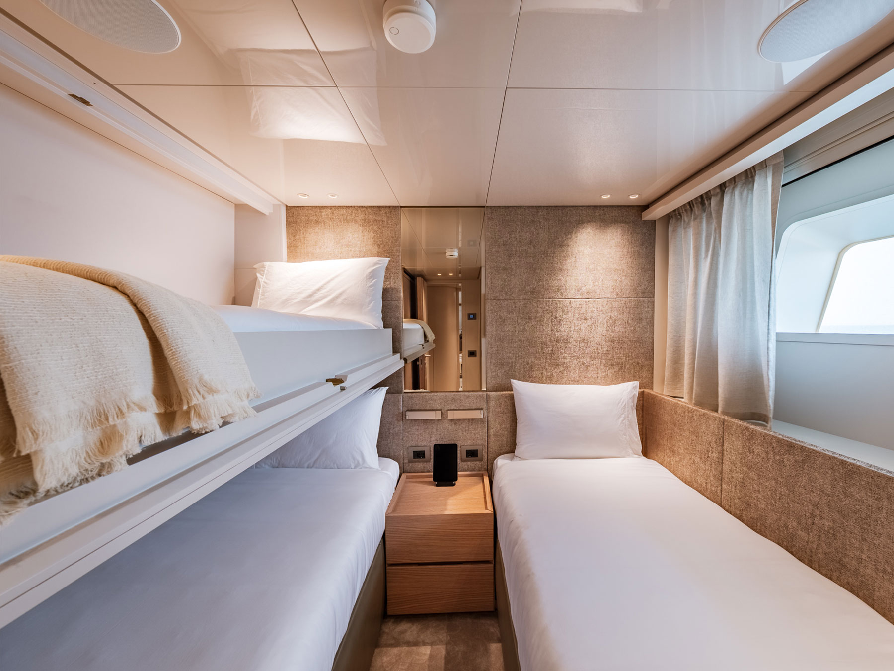 Gemide, beş adet en-suite kabin mutlak mahremiyet ve konfor sağlar. Ana güvertede yer alan sahibi süiti, özel ve ayrıcalıklı alanlar sunar. Alt güvertede, konukların farklı ihtiyaçlarını karşılamak ve konaklamaları boyunca en yüksek konfor standartlarını sağlamak için iki VIP kabin ve biri pullman yataklı olmak üzere iki ikiz kabin olmak üzere dört ek kabin bulunmaktadır.